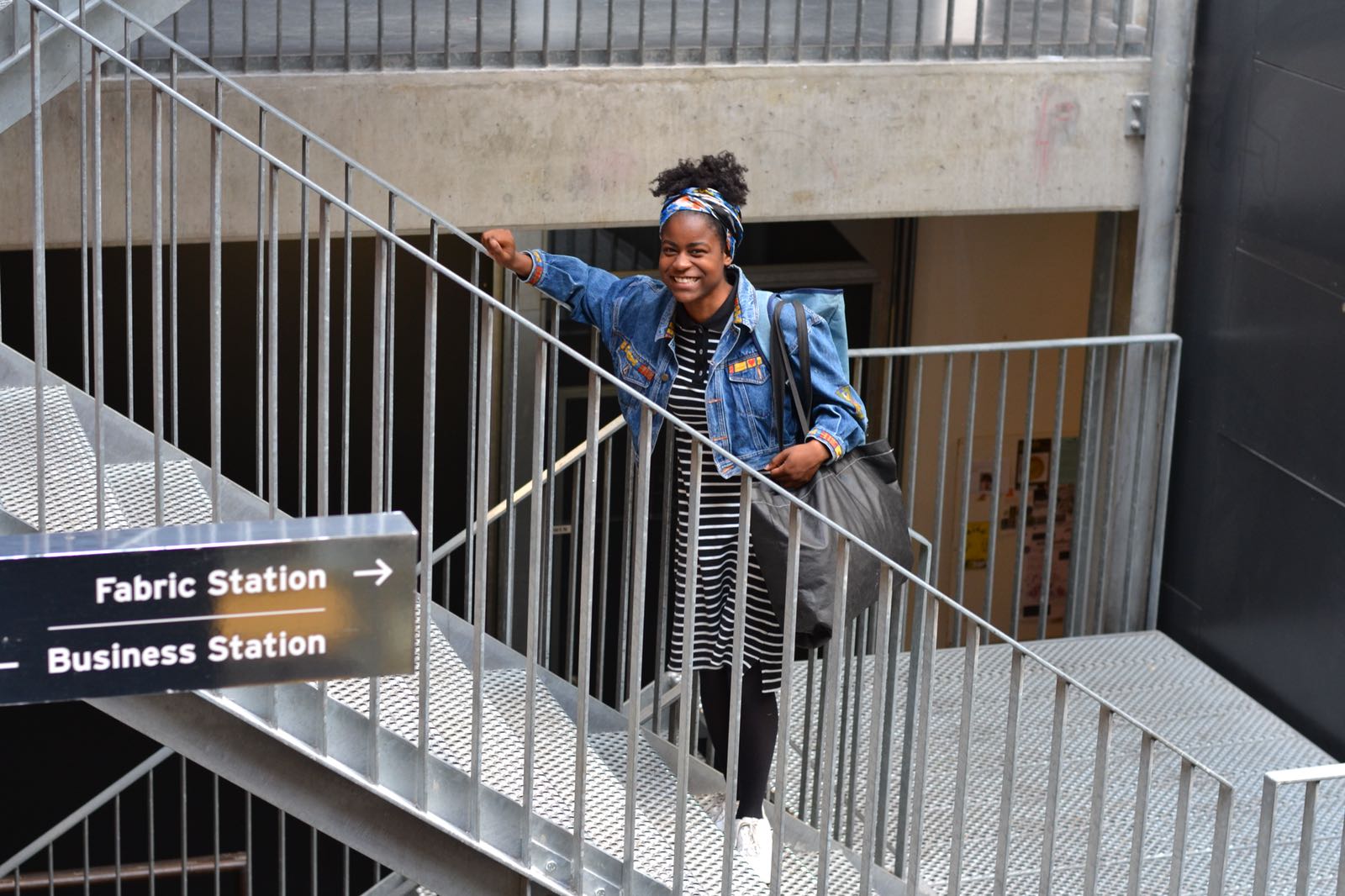 In the Fabric Station, I see a different Meliange take over – she is clearly in her element. Wearing a vintage denim jacket with colourful bands across the sleeves and pockets, she tells me denim is her trademark, a love she shares with her mother. Calm and collected, with a focused gaze, loose pieces of fabric form an ensemble within minutes.